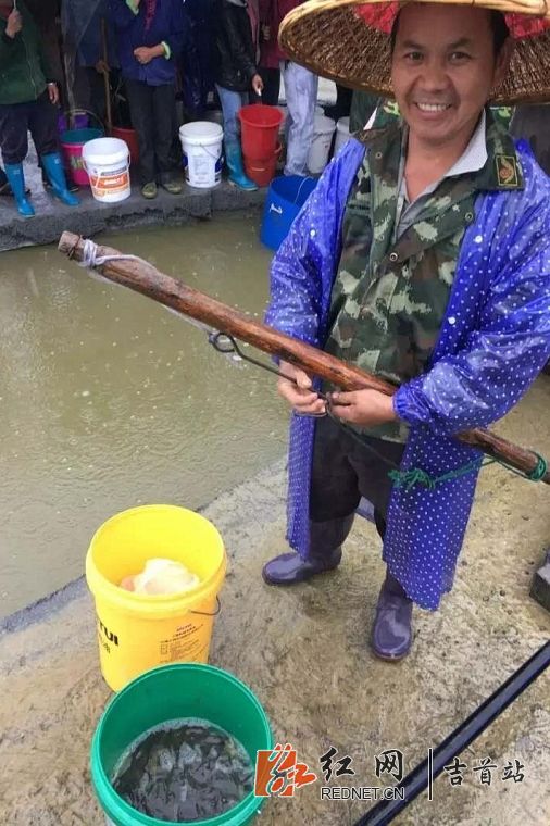 红网吉首站4月27日讯(通讯员兰玖勇 吴亮 李鼎曦)4月25日,春雨淅淅沥沥,马颈坳镇雅沙村村民一大早就提着桶子赶往该村稻香鱼繁育基地,免费领取鱼苗。在鱼苗发放现场,村民们围聚在鱼苗基地池塘边,看着跳跃翻腾的鱼苗,大家笑得合不拢嘴。当天该镇共为村民发放鱼苗4万余尾,其中为建档立卡户发放鱼苗3万尾。