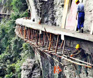 图:建设者在悬崖绝壁上安装钢管架