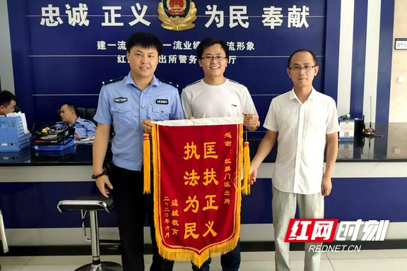 红网吉首站6月17日讯(通讯员 宋梓绮)6月17日上午,吉首边城教育机构为市公安局红旗门派出所送来了“匡扶正义、执法为民”的八字锦旗,以此感谢派出所全体民辅警破获其被盗一案,并追回被盗物品,坚实守卫了辖区居民的生命财产安全。
