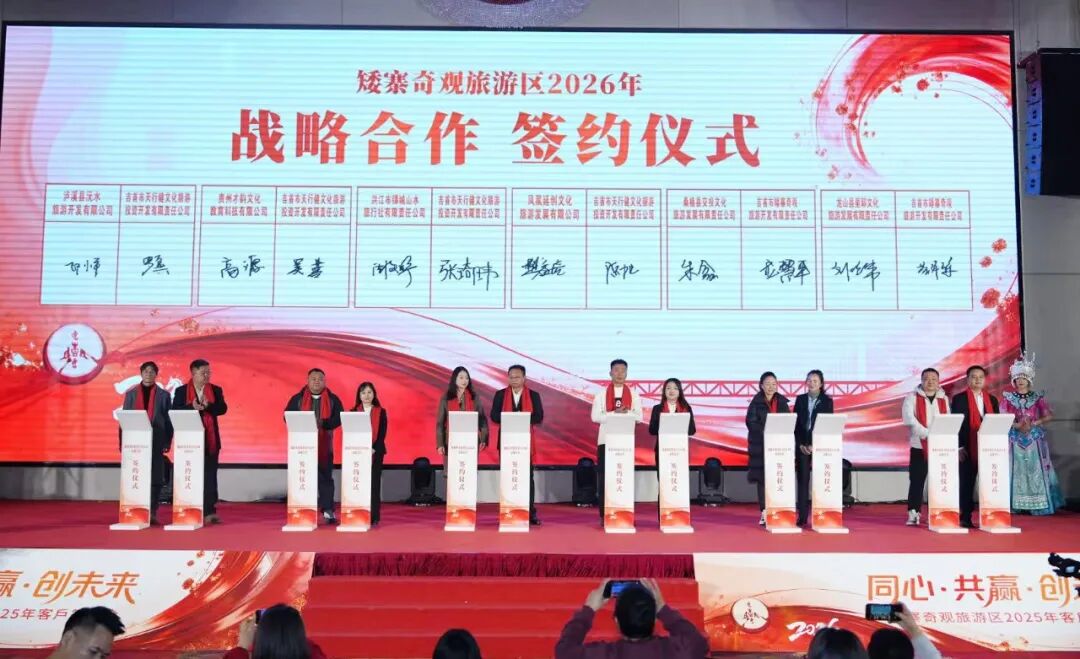 现场,矮寨奇观旅游区与多家旅行社、研学机构签订年度合作协议,为2026年市场开拓筑牢基础。