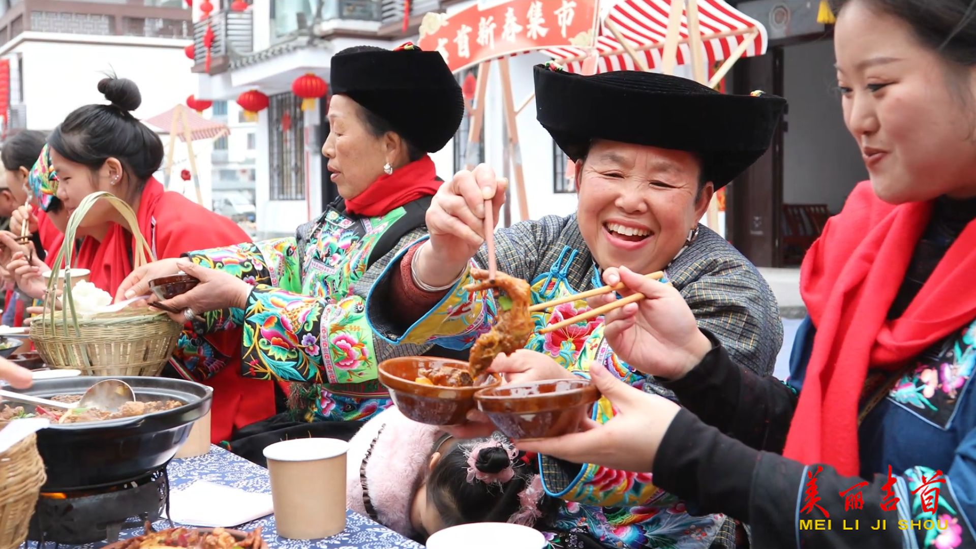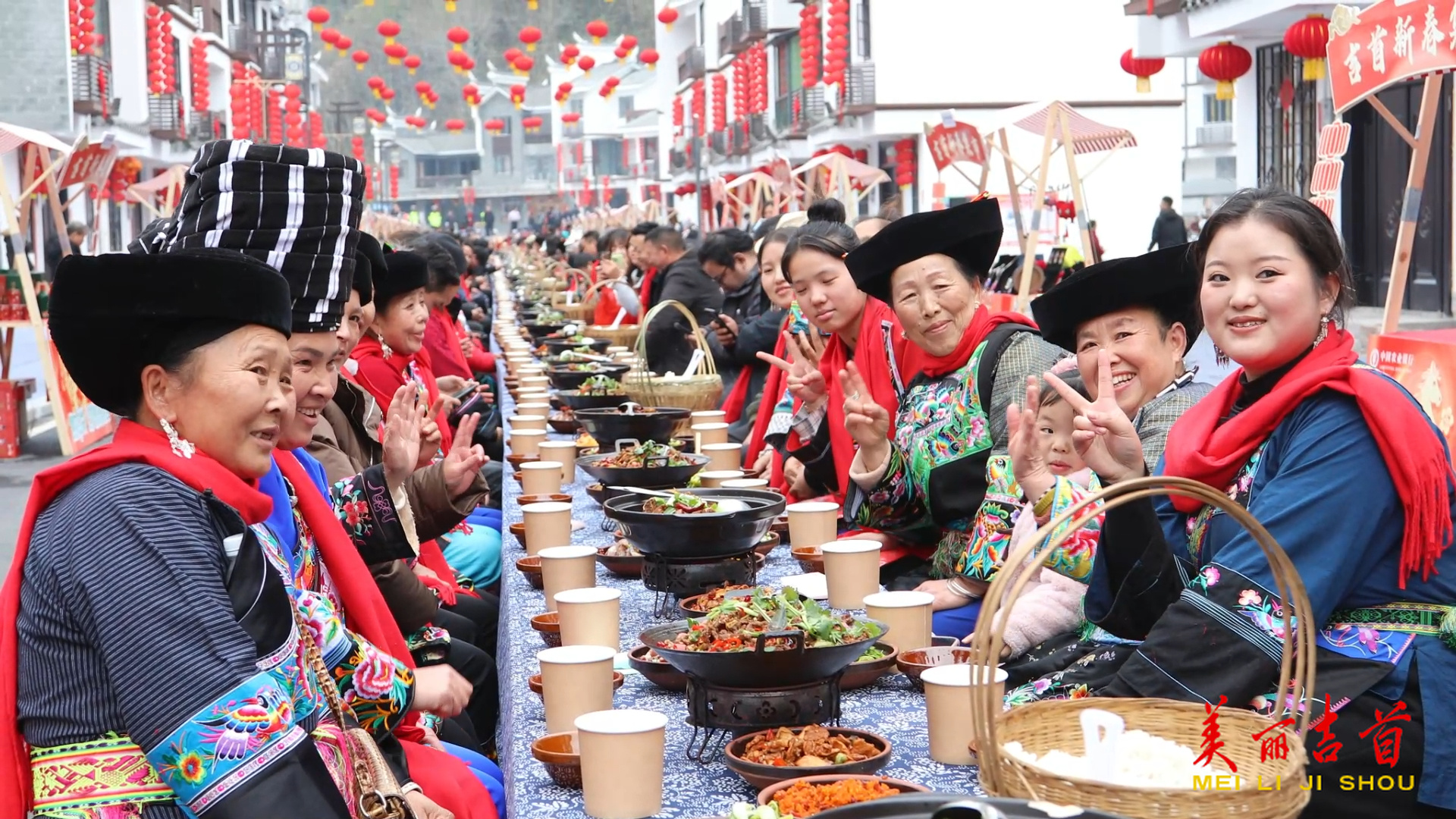 大红灯笼高高挂,安置区里年味浓。身着盛装的乡亲们汇聚在中心广场,银饰叮当,笑语盈盈。苗狮登高,步步攀升,寓意生活节节向上;苗鼓激越,声声昂扬,擂响崭新岁月的精气神。最热闹的还数融汇了苗族风情与立春韵味的“长桌宴”。数十张木桌连成一条蜿蜒的长龙,腊肉、香肠、糯米酸、米豆腐等佳肴,与时令春蔬缤纷呈列。席间,晚辈为阿婆夹菜,青年为邻座递饭,你敬我让之间,流淌着邻里真情与新社区的和睦。饭至酣处,苗歌自然而起,唱得是团聚的喜悦,更是对如今幸福生活的礼赞。“大家都搬进安置区了,出门都是老熟人,今年过年,将是我们最团圆的一个年。”矮寨镇村民刘诗怡高兴地说道。