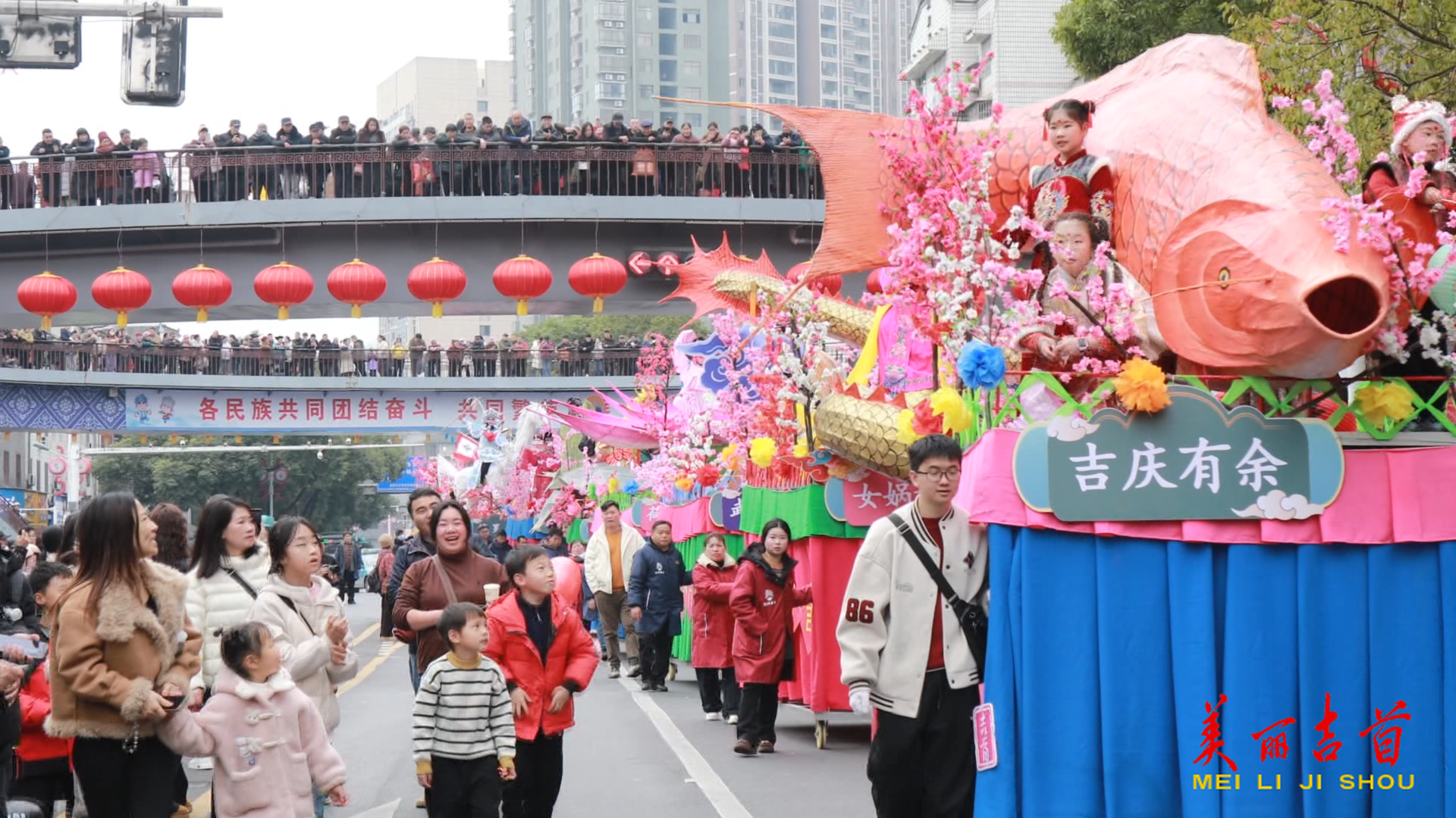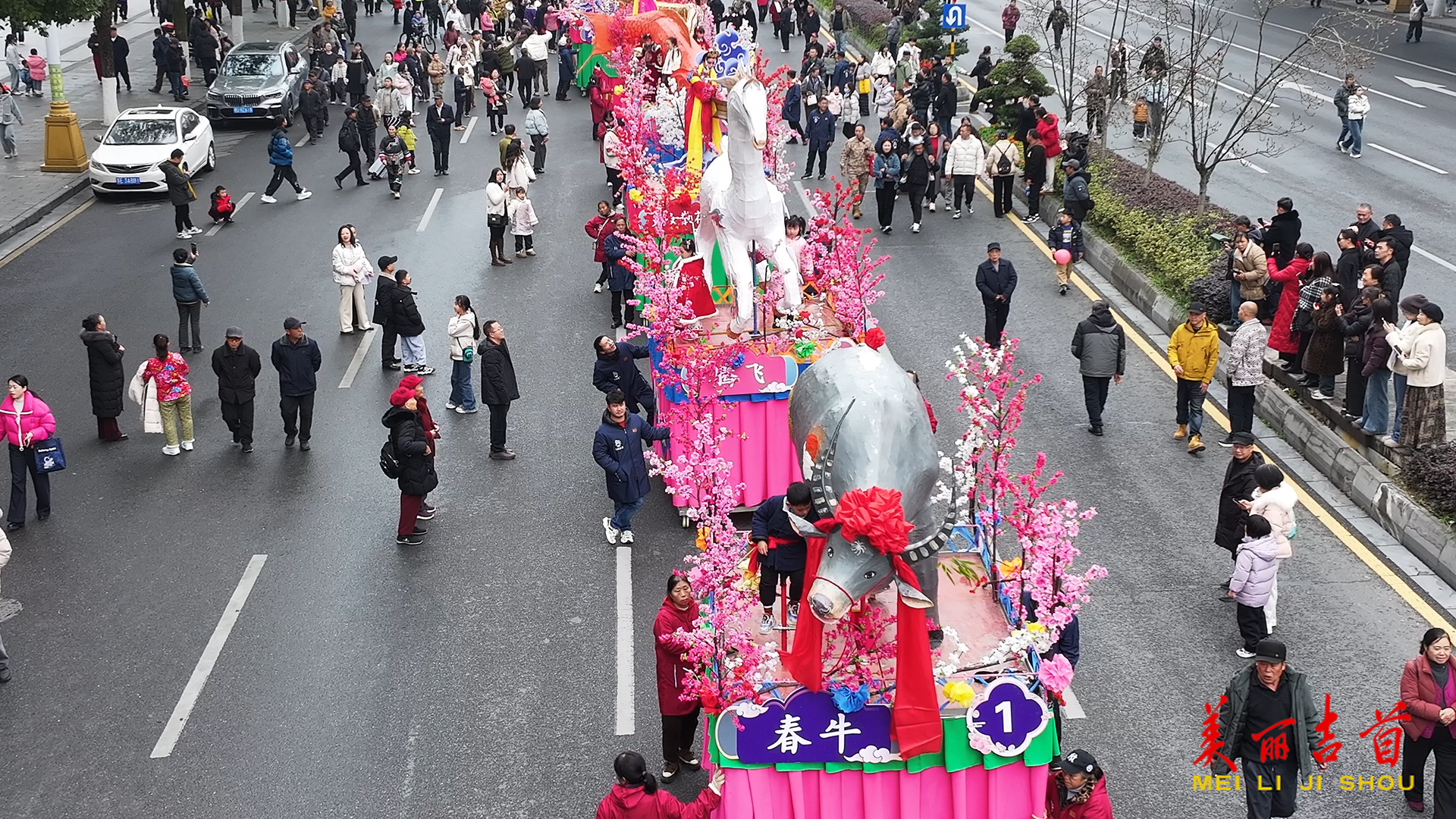 吉首市融媒体中心2月22日讯(全媒体记者 刘丹 何鑫 彭开成 通讯员 石薇)2月19日,农历正月初三,湖南省吉首市特色民俗“乾州春会”热闹上演。17支民俗队伍、12台造型各异的“春”穿街过巷,在巡游展演中为市民游客送上新春祝福。