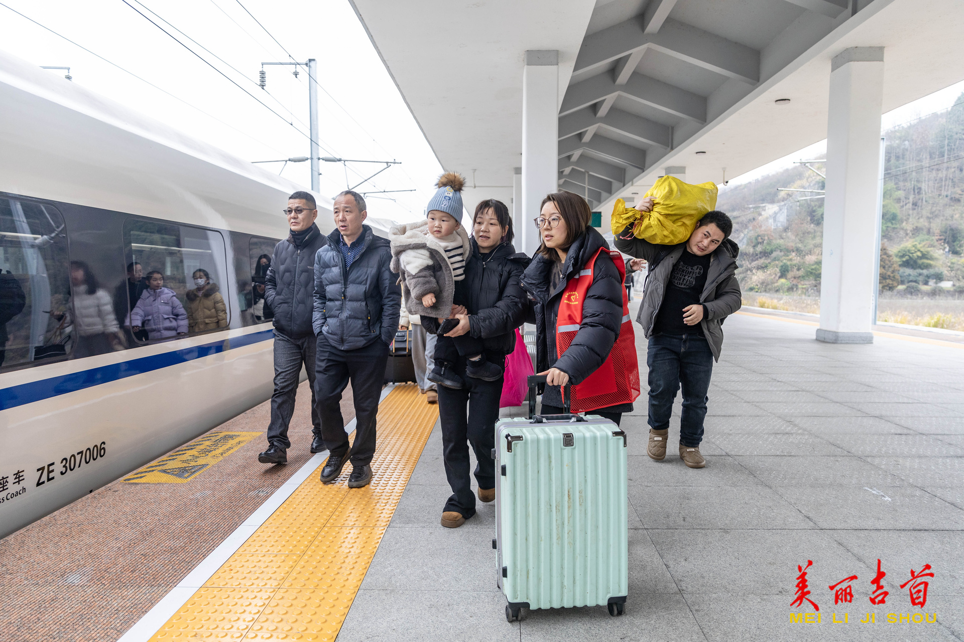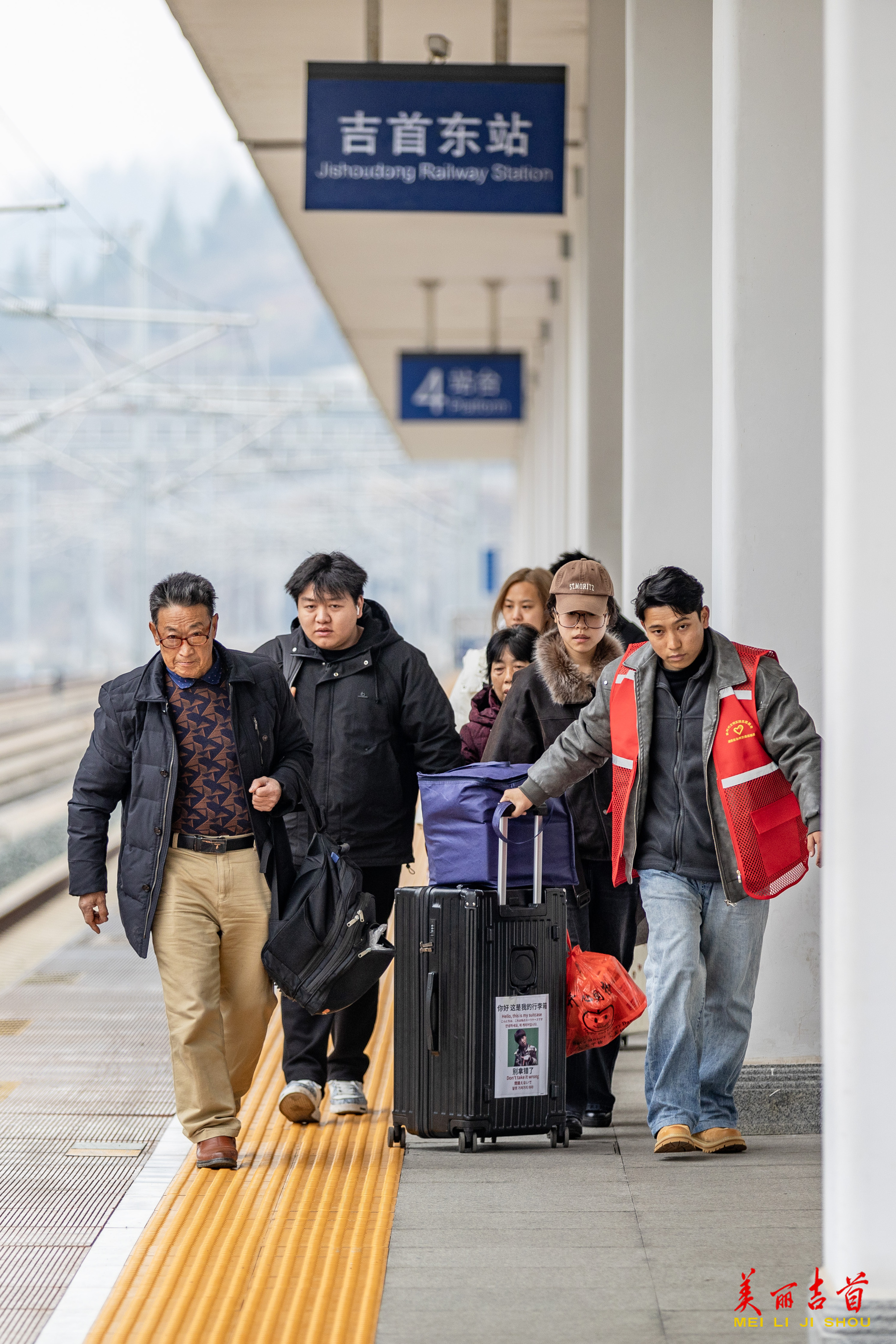 △2026年2月2日,张吉怀高铁吉首东站,旅客在湘西州交通运输局志愿者的帮助下准备乘车。