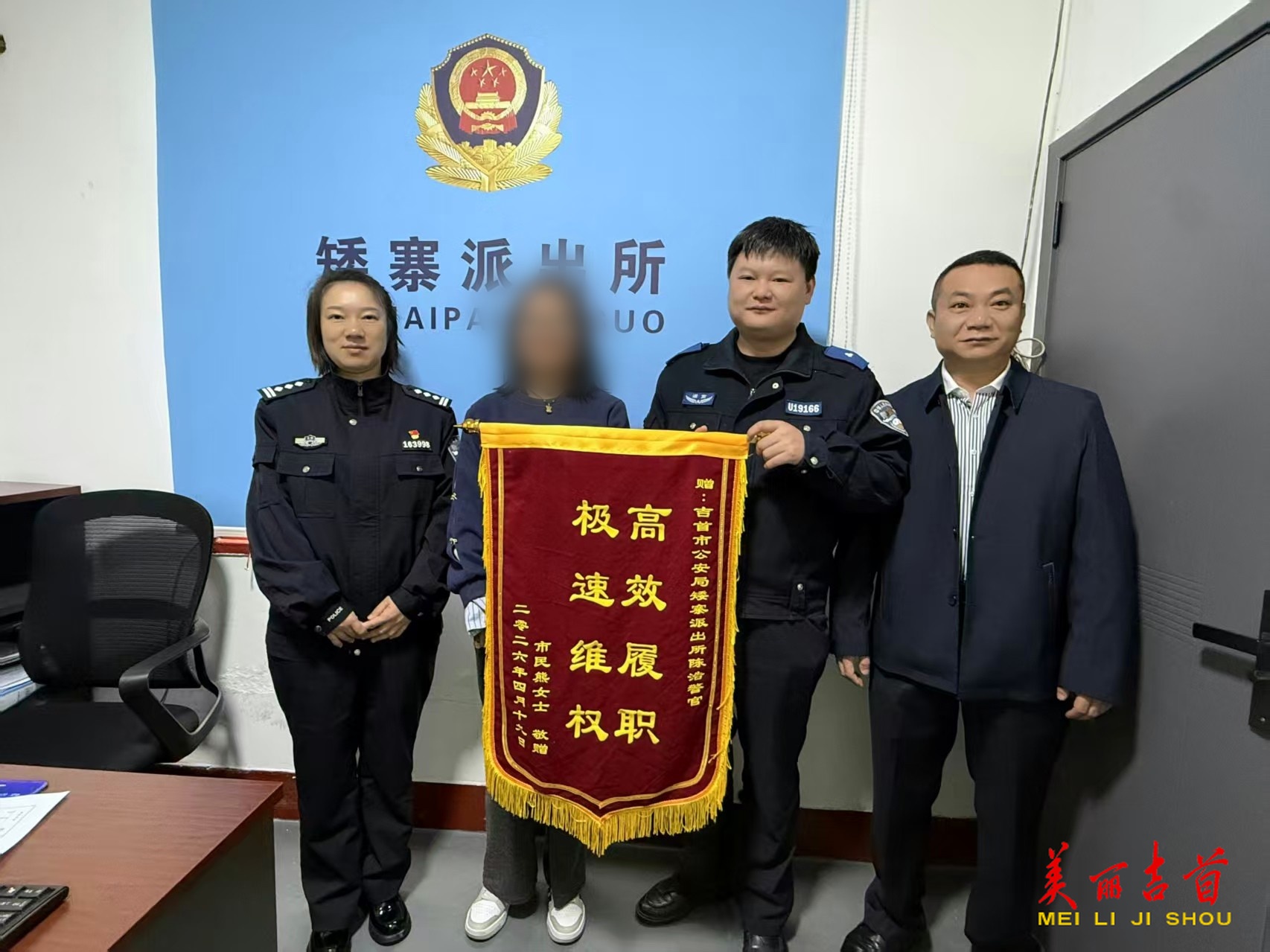 吉首市融媒体中心4月24日讯(通讯员 麻琼)4月22日上午,市民熊女士来到吉首市公安局矮寨派出所,送上一面写有“高效履职,极速维权”的锦旗,感谢民警快速处置一起危险驾驶行为,维护群众合法权益。