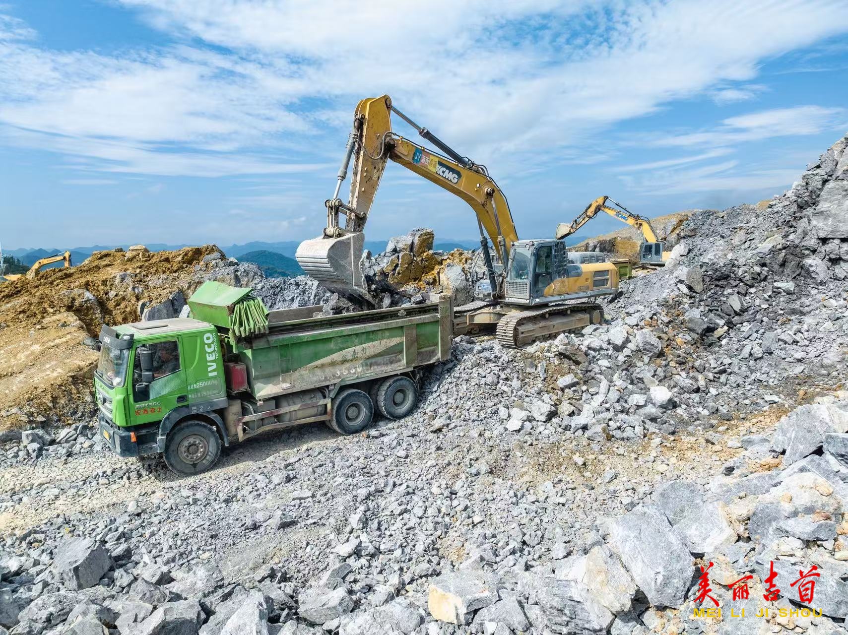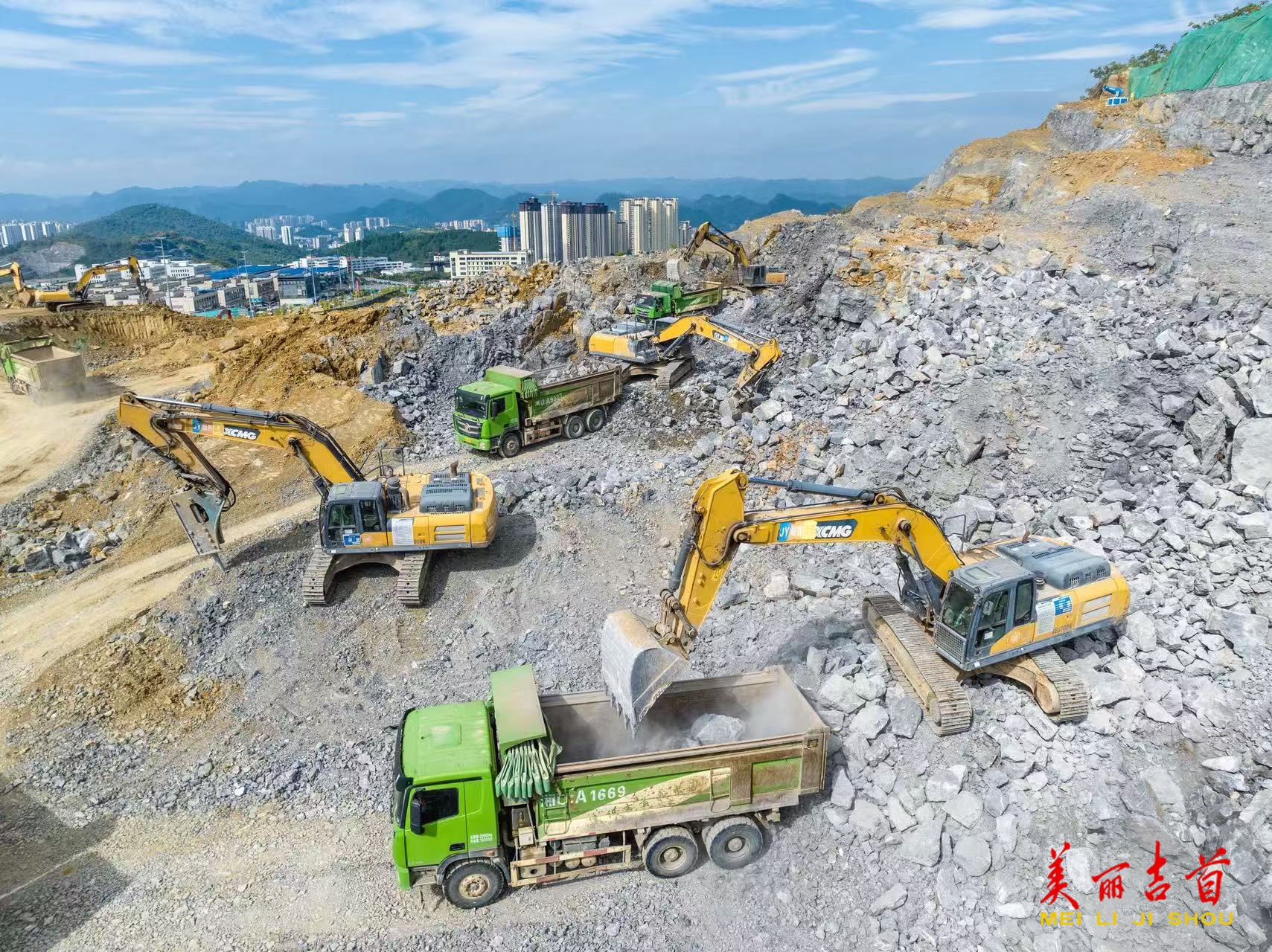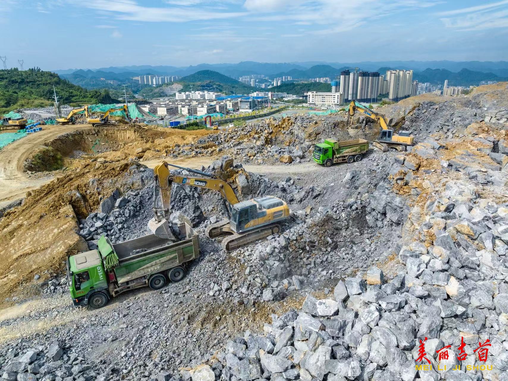 10月2日,吉首市建筑材料产业园项目工地,建设者操作挖掘机在施工作业,工程车来回穿梭,现场一派繁忙。国庆中秋长假,吉首市重点工程项目的建设者们坚守岗位,在忙碌的辛勤劳动中度过假期,全力以赴推进工程建设。