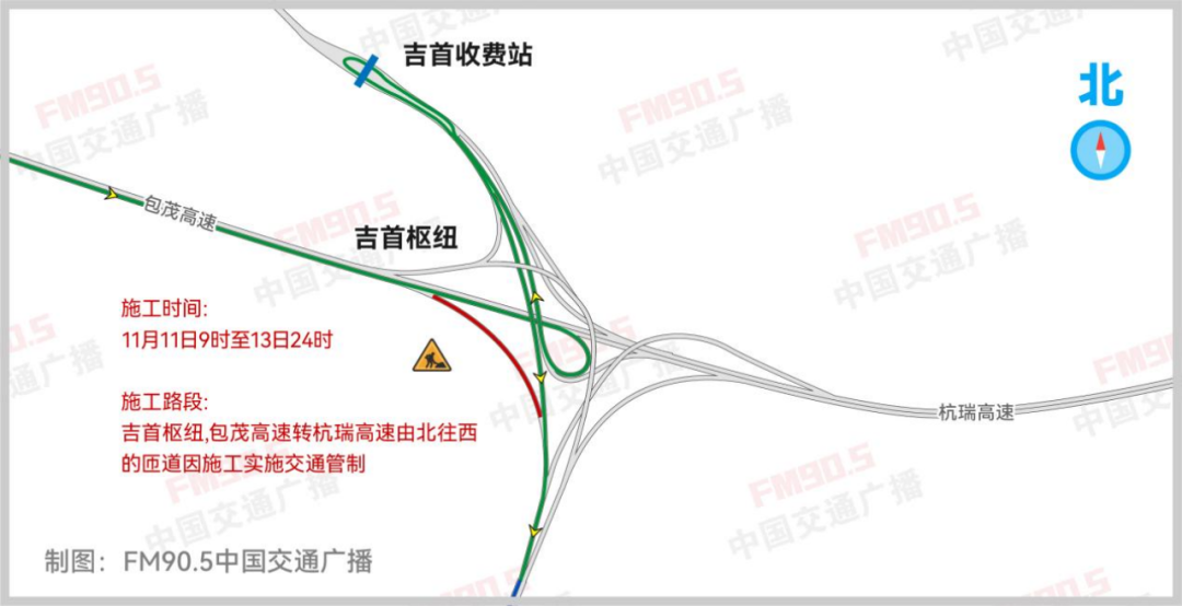 11月11日9时至13日24时,G65包茂高速吉首枢纽(包茂高速转杭瑞高速由北往西方向)将进行路面整治施工,期间实施交通管制。请司机朋友注意规划路线,及时绕行。