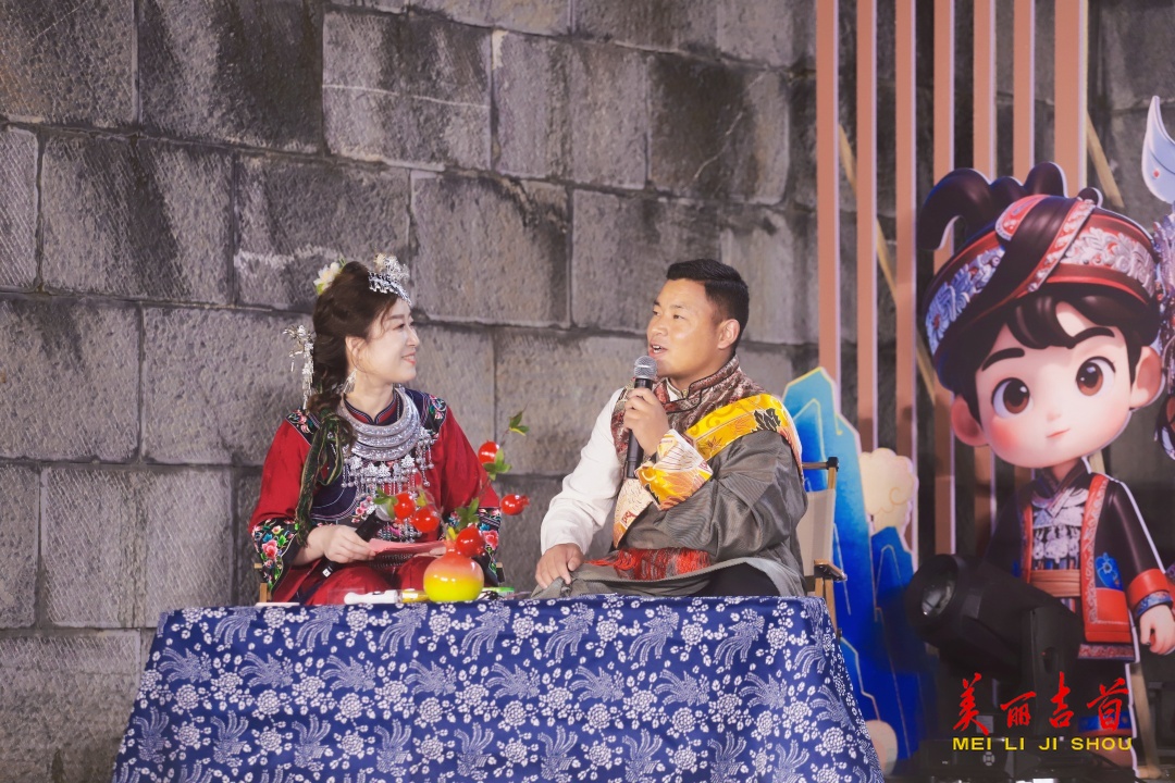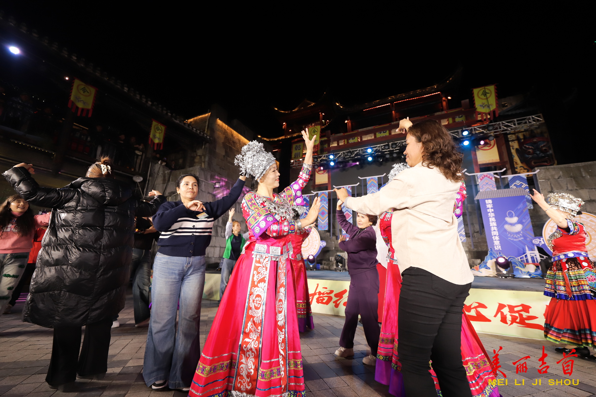 国家一级独唱演员龙仙娥演绎《苗族飞歌》《美在山水间》,歌声尽展山野辽阔与苗家深情。当新疆朋友登台献唱时,来吉首市考察交流的新疆代表团成员们自发来到台前,用维吾尔族舞蹈和音乐回应湘西人民的热情,悠扬的旋律下,苗家姑娘们学习起了维吾尔族舞步,“苗疆”共舞画面让晚会气氛瞬间沸腾。